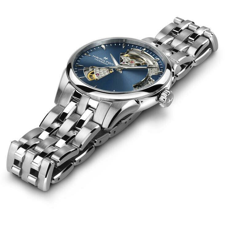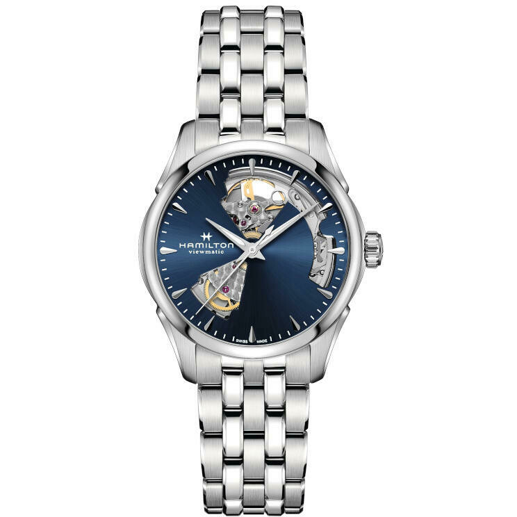 Orologio Hamilton Jazzmaster Open Heart con cassa in acciaio da 36 mm e vetro zaffiro. Cinturino in acciaio e quadrante Blu, il design del quadrante è traforato open heart così da poter vedere parte del movimento finemente decorato e il bilanciere. Indici e lancette in acciaio color oro.