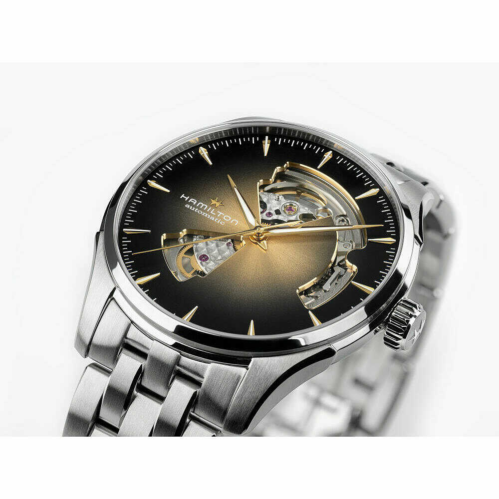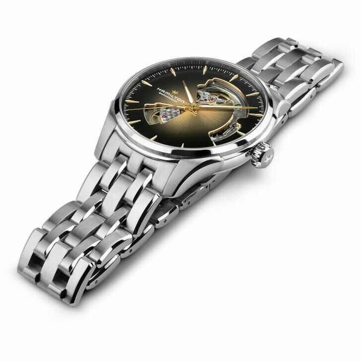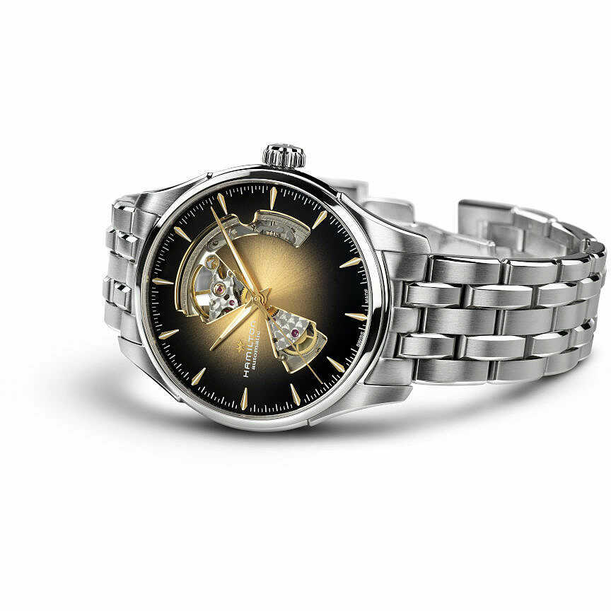 Orologio Hamilton Jazzmaster Open Heart con cassa in acciaio da 40 mm e vetro zaffiro. Cinturino in acciaio e quadrante Nero con finitura soleil e dettagli oro, il design del quadrante è traforato open heart così da poter vedere parte del movimento finemente decorato e il bilanciere. Indici e lancette in acciaio color oro.