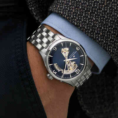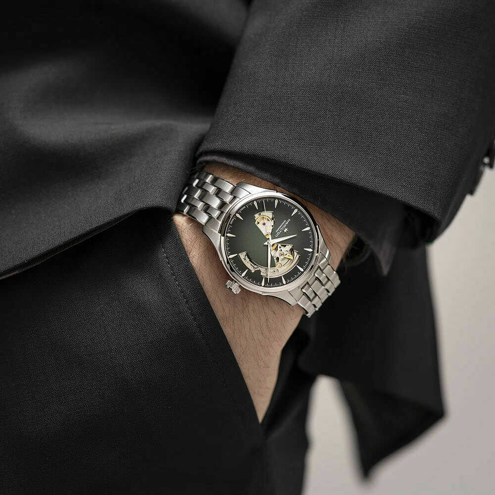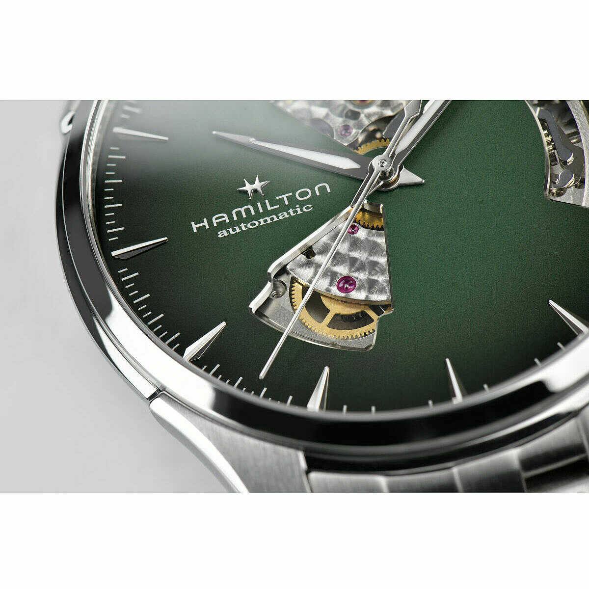 Orologio Hamilton Jazzmaster Open Heart con cassa in acciaio da 40 mm e vetro zaffiro. Cinturino in acciaio e quadrante Verde sfurmato con design traforato così da poter vedere parte del movimento finemente decorato e il bilanciere. Indici e lancette in acciaio.