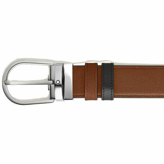 Cintura Montblanc reversibile in pelle stampa Saggiano Fulvo mentre l'altro lato è in pelle nera liscia.