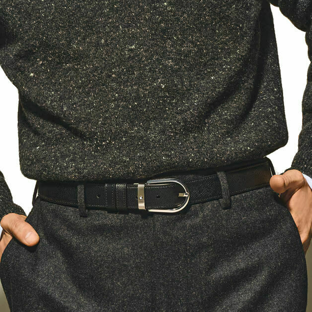 Cintura Montblanc realizzata in pelle reversibile in pele con stampa Saffiano e in pelle liscia classica. Fibbia in acciaio a forma di ferro di cavallo con finiture palladio.