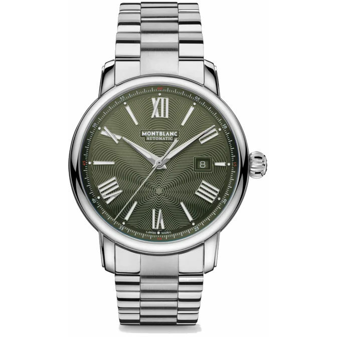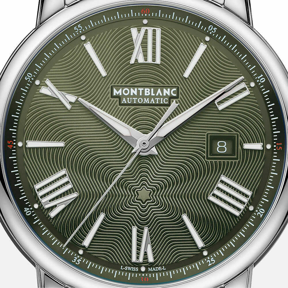 QuestoMontblanc Star Legacy Automatic Date in edizione limitata di 800 esemplari è impreziosito da un quadrante verde con l’iconico motivo a stella variabile Montblanc e con indici a forma di spada e numeri finitura rodio. È alimentato dal movimento automatico Swiss Made MB 24.17 che indica ore, minuti, secondi e data.