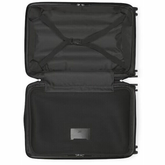 Trolley Montblanc di grande capacità realizzato in policarbonato leggero nero con raffinate finiture in pelle nera. Scivola senza fatica grazie alle 4 ruote silenziose con cuscinetti a sfera, con manico stabile a più lunghezze con sistema di blocco multiplo e comodi manici in pelle.