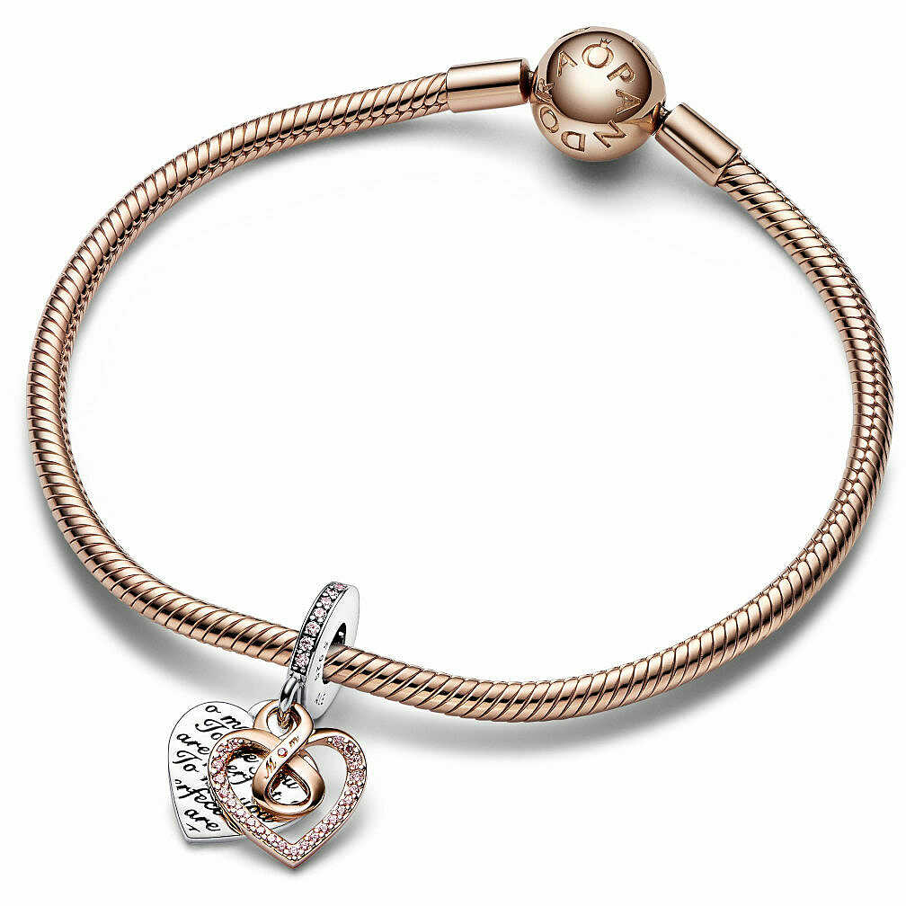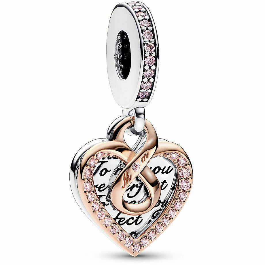 Charm Pandora Pendente Cuore Infinito Mamma Sei Perfetta presenta un pendente a forma di cuore con lavorazione openwork e placcatura in oro rosa 14k che forma un simbolo dell'infinito al centro.
