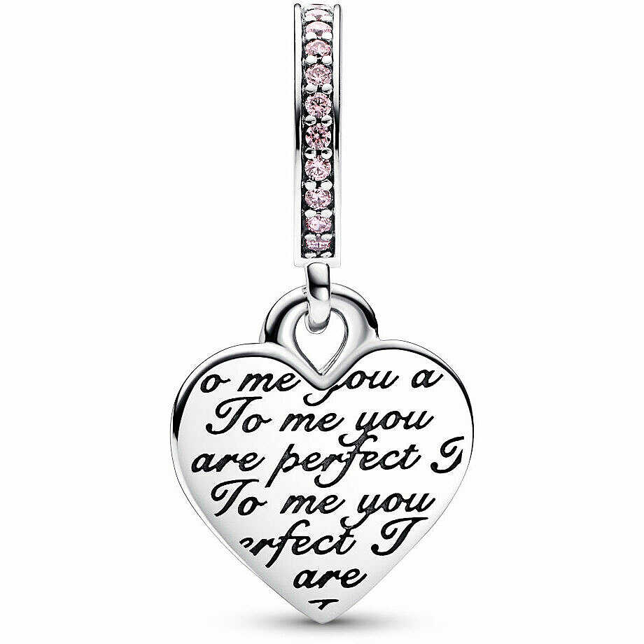 Il cuore è decorato da una fila di pavé rosa e dall'incisione "Mom", con una pietra di zirconia cubica rosa che forma la lettera "o". Dietro si trova un disco a forma di cuore in argento con l'incisione "To me you are perfect" (Per me sei perfetta) che crea un motivo ripetuto su entrambi i lati. Il pavé rosa sull'anello passante aggiunge il tocco finale.