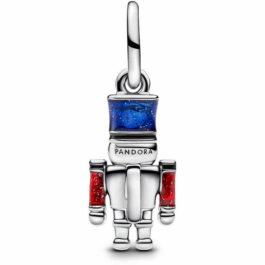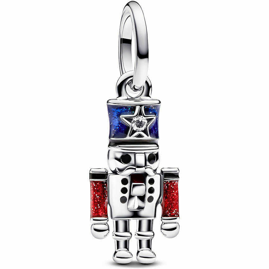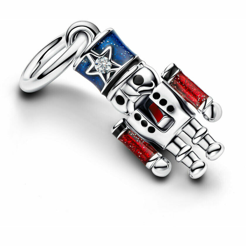 Realizzato in argento, la bocca dello schiaccianoci si apre verso l'alto e verso il basso con una piccola leva. Lo smalto blu e rosso glitterato aggiunge un tocco vivace alla sua tradizionale uniforme e una pietra scintillante risplende dalla stella sul suo cappello.