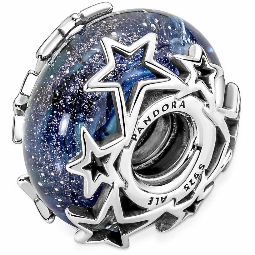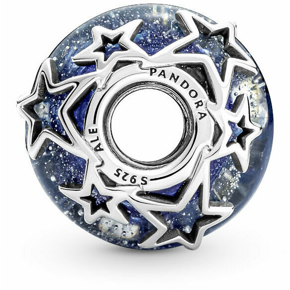 Rifinito a mano e realizzato in argento, il charm presenta vetro di Murano blu scintillante circondato da stelle intagliate asimmetriche di dimensioni diverse in argento.