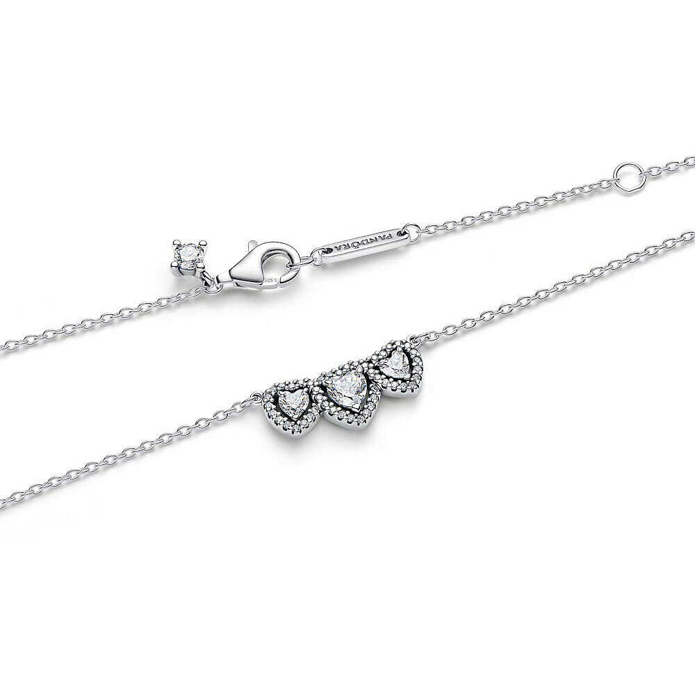 Per il passato, il presente e il futuro. Questa collana in Argento Sterling 925 è decorata da tre pietre a forma di cuore collegate da un pavé di punti luce. Un simbolo luminoso dell’amore in tutte le sue fasi.