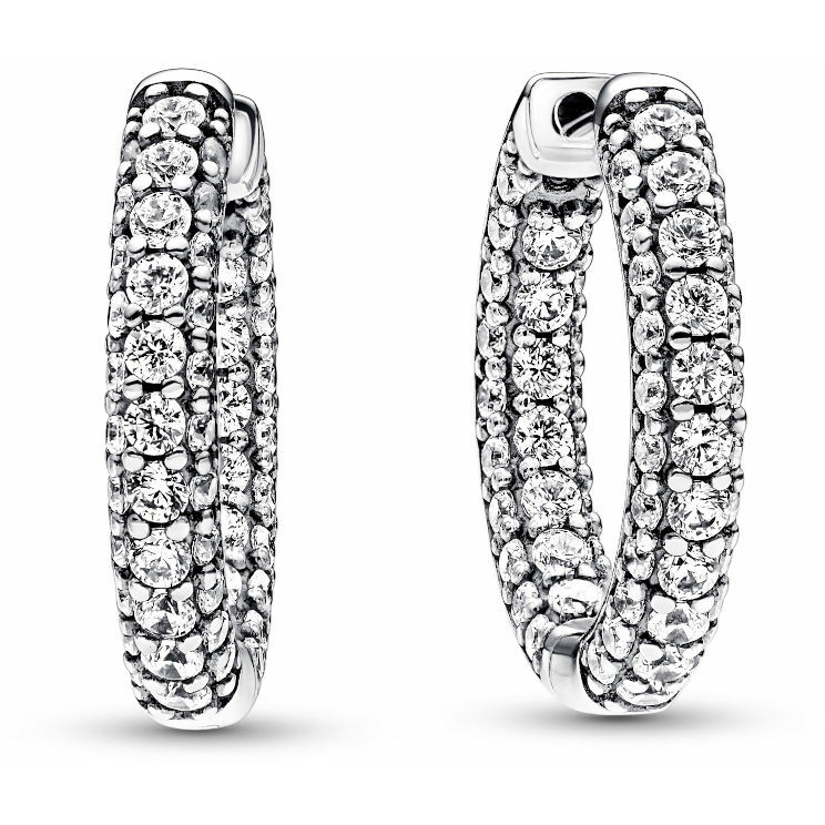 Orecchini da donna Pandora a cerchio realizzati in agento con pavè di zirconi bianchi e incastonate a granette.