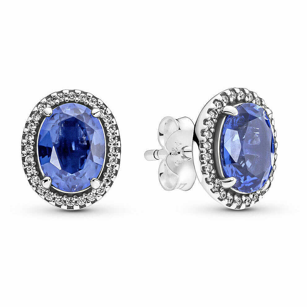 Scenografici cristalli blu ovali in rilievo creati dall’uomo sono incorniciati da scintillanti pietre di zirconia cubica incolori che conferiscono agli orecchini un’aria da gioielli di famiglia vintage.