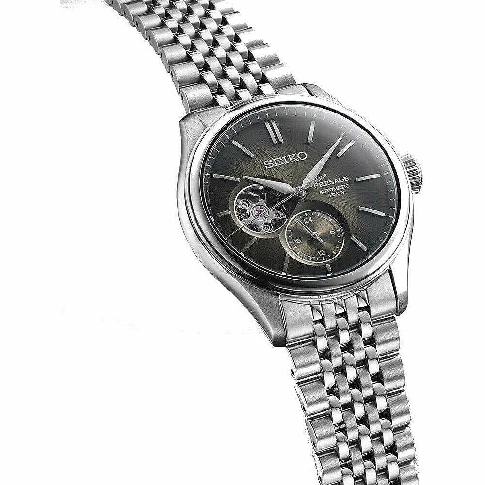 L'orologio Seiko Presage Classic Series SPB471J1 è animato dal calibro 6R5J, un nuovo calibro della famiglia di movimenti 6R che offre una riserva di carica di 3 giorni. Il quadrante curvo grigio antracite ha un'apertura sul bilanciere del movimento.