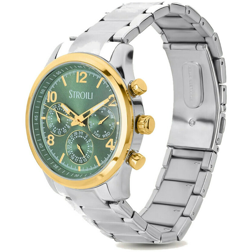 Orologio Stroili da uomo realizzato con cassa in acciaio da 43 mm e ghiera color oro, cinturino in acciaio e quadrante verde con indici e lancette dorate.